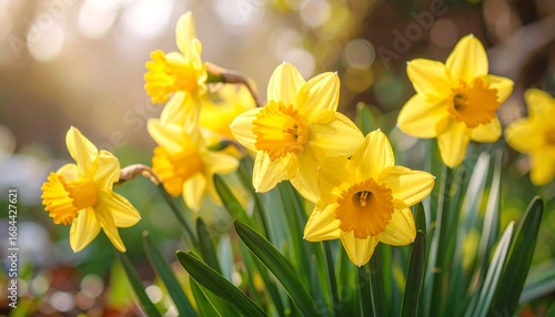Vibrant yellow daffodils bloom in a garden, bathed in golden sunlight.