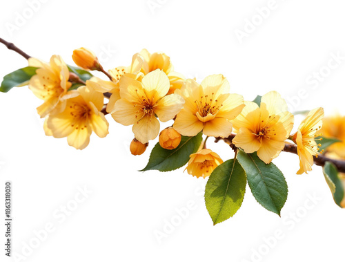 Vibrant yellow spring flowers and delicate buds on a blossoming branch with fresh green leaves, illuminated by sunlight. Beautiful floral element, isolated.