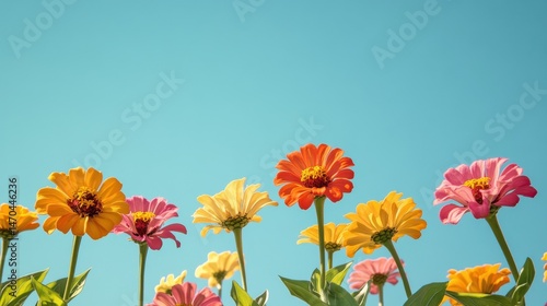 Vibrant zinnia flowers blooming against a clear blue sky in the autumn season