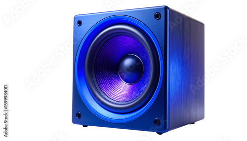 Vibrating audio speaker emitting blue-purple illumination, generating hypnotic light pattern isolated on solid white background Png form