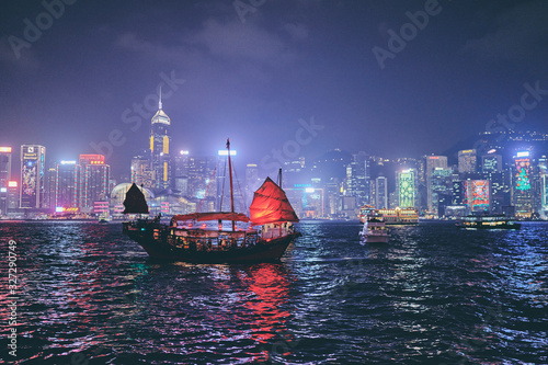 Victoria Harbour Hong Kong night view with junk ship on foreground.