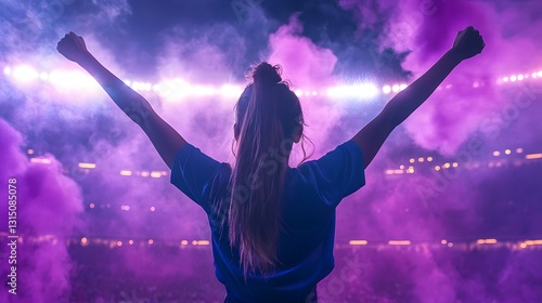 Victorious fan celebrates in stadium surrounded by purple smoke. Excitement and achievement fills air