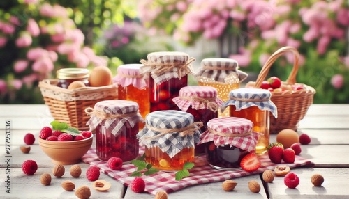 Viele hübsche Gläser mit selbstgemachter Marmelade auf einem Tisch im Garten