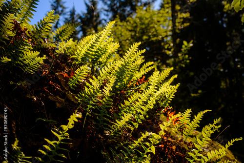 Viele kleine Farnpflanzen im Sonnenlicht