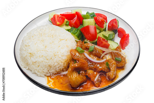 Vietnamese cuisine and food, white rice with boiled chicken meat and vegetables on a plate, on a white isolated background