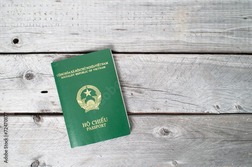 Vietnamese passport against wooden background