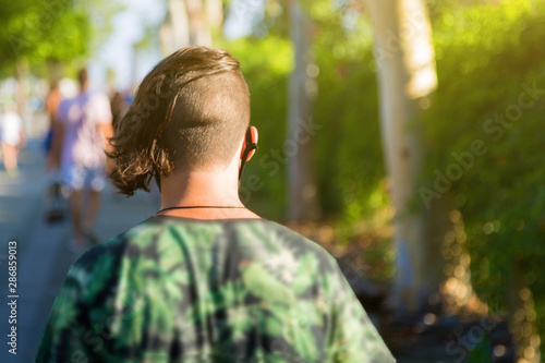 View from a pin on a man with a short haircut on his head as he walks along the street. Back view of a young man with creative haircut.