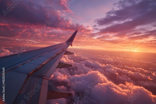 View from an airplane window looking out at a stunning purple and orange sunset with the silhouette of the aircraft wing over fluffy clouds.
