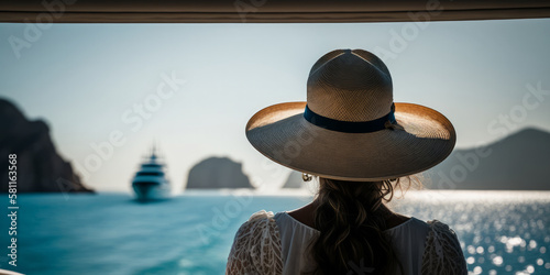 view from behind woman looking out to sea from a luxury cruise boat . Generative ai