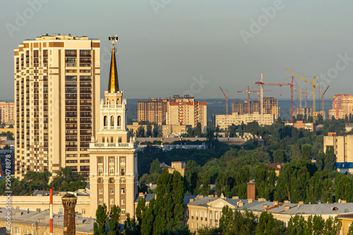 View from window of skyscraper on city. Tower building of management of South-Eastern Railway. Cityscape. Voronezh, Russia, June, 2019: