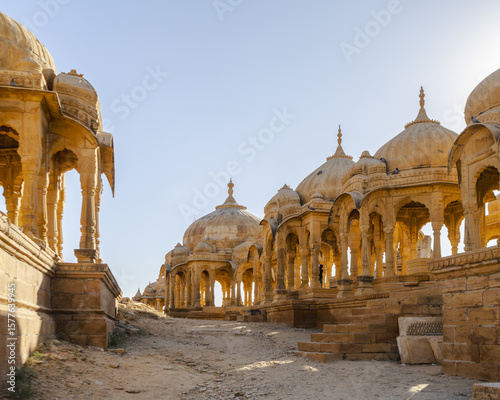 View of ancient sandstone structures, arches, and domes bathed in the warm glow of the desert sun, creating a timeless scene, Jaisalmer, Rajasthan, India.