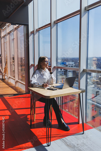 View of focused woman in casual wear typing on netbook while working on new project sitting at table in modern workspace