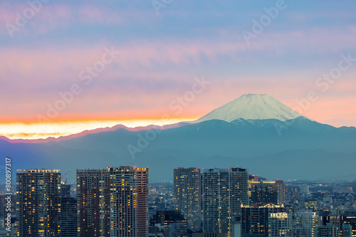 View of Mount Fuji from Tokyo, Japan at sunset