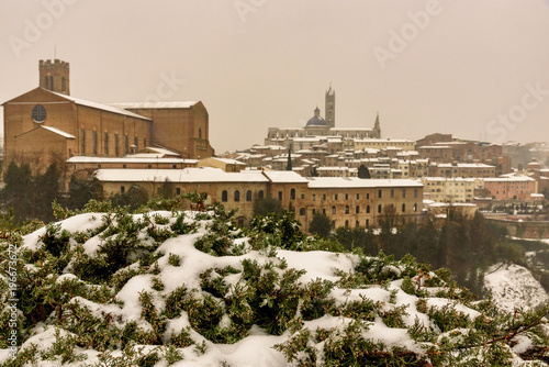 View of Siena in winter during a snowfall