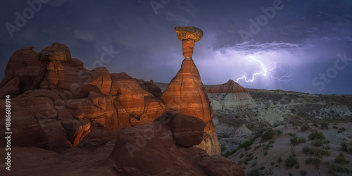 View of striking lightning electrifies the sky behind the sandstone formations and arid landscape, painting a dramatic scene of nature's power, Escalante, Utah, United States.