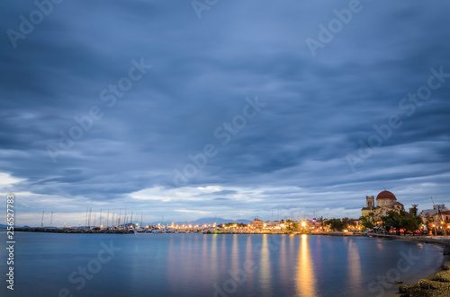 View of the beautiful island of Aegina in Saronikos gulf Greece during blue hour