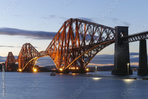 View of the illuminated Forth Bridge, a striking red cantilever railway bridge, spans the calm, reflective waters under a dusky sky, Edinburgh, Scotland, United Kingdom.