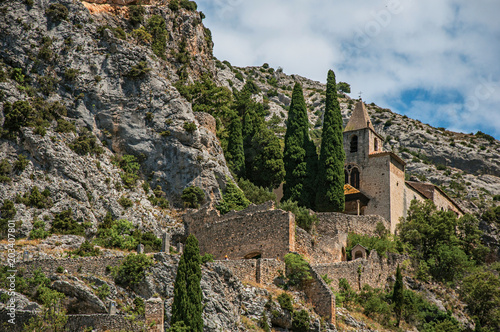 View of the Notre-Dame de Beauvoir church amidst cliffs and rock stairway, above the graceful Moustiers-Sainte-Marie village. Alpes-de-Haute-Provence department, Provence region, southeastern France