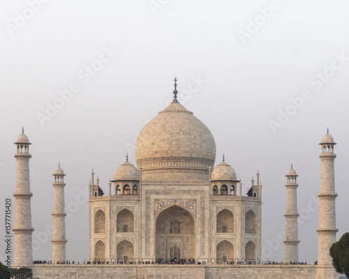 View of the Taj Mahal's ivory-white marble shimmers softly under the pale sky, its majestic dome and minarets standing in serene grandeur, Agra, Uttar Pradesh, India.