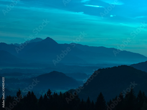View on the beautiful sunrise over the majestic hills with the Lake Bled in Slovenia