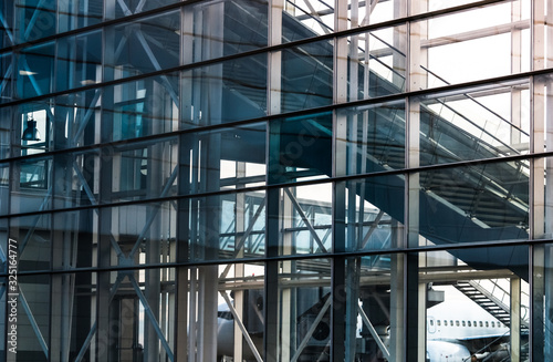 View on the modern glass facade with escalator at the airport. Modern architecture, glass and metal.