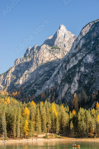 View over the Braies Lake Lago di Braies and Dolomite mountain summits nearby in Autumn October colors at blue sky, Dolomites, South Tyrol, Italy