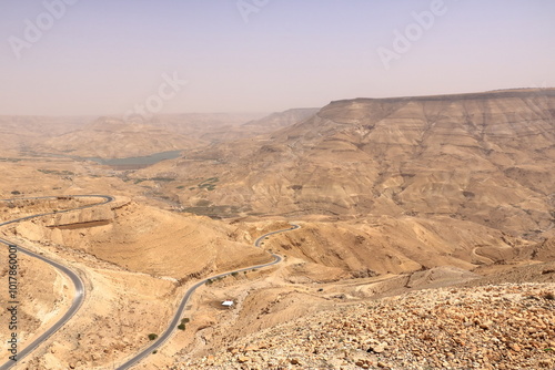 Viewpoint at Highway 35 in Jordan: Mujib Moujib Dam on Wadi Mujib River, between cities of Madaba and Kerak