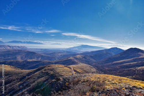 Views of Wasatch Front Rocky Mountains from the Oquirrh Mountains with fall leaves, Hiking in Yellow Fork trail and Rose Canyon in Great Salt Lake Valley. Utah, United States. USA.
