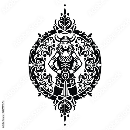 viking female with folk art decoration in black and white illustrations, cutout graphic