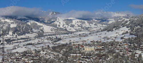 Village and holiday resort Gstaad in winter, Swiss Alps.