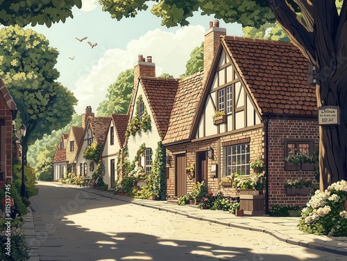 Village road bordered by old oak trees, traditional houses with blooming gardens, idyllic countryside