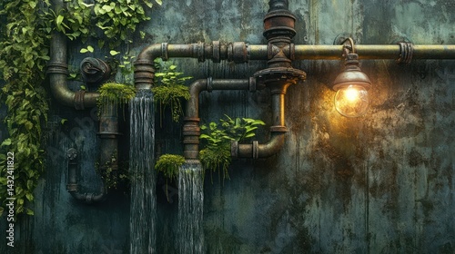 Vines & greenery cover rusty pipes, weathered wall & hanging bulb shines bright