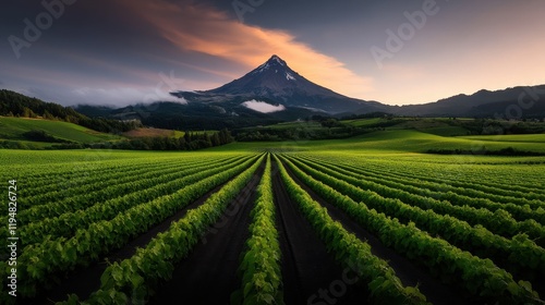 Vineyard Rows at Sunset with Majestic Mountain in Background