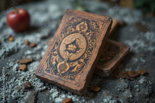 Vintage Book with Decorative Cover and an Apple on a Stone Table