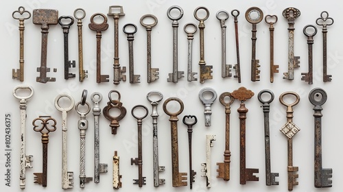 vintage brass keys, each boasting its own unique size and shape, adorned with intricate designs, meticulously arranged against a solid backdrop of white, gray, or dark hues.