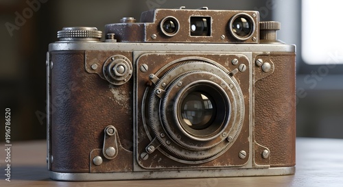 Vintage brown leather and metallic camera with worn distressed texture