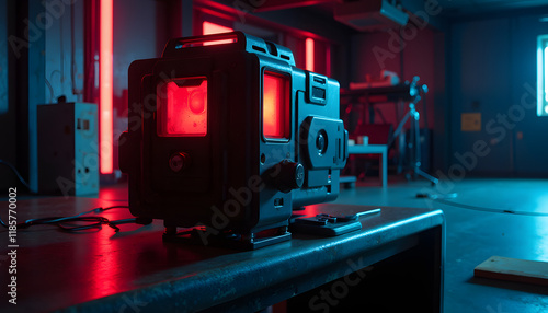 Vintage camera on a table illuminated by red and blue lights in a creative workspace