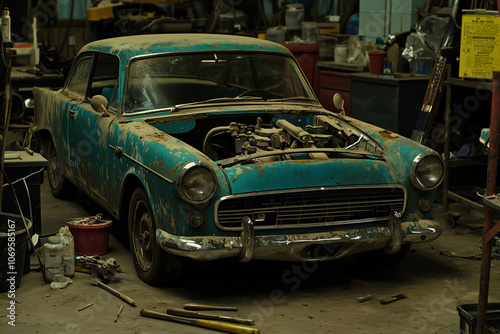 Vintage Car Restoration in Workshop with Exposed Engine Cluttered Tools and Gritty Charm