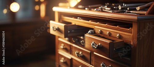 Vintage carpentry tool chest, with drawers open revealing tools, in warm lighting