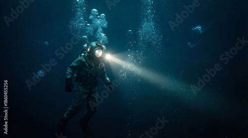 Vintage Deep Sea Diver Exploring Dark Ocean With Flashlight Beam