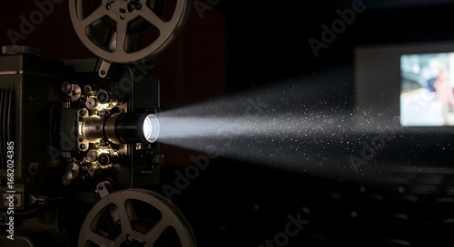 Vintage film projector casting light beam onto screen in dark cinema.