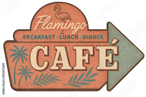 Vintage flamingo cafe sign, advertising breakfast, lunch, and dinner in a tropical setting. Vintage emblem badge patch, retro design, transparent background