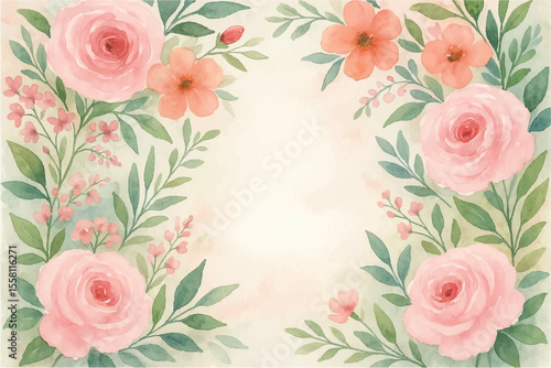 Vintage floral background with romantic pink roses, elegant frame, and decorative hearts for a wedding or Valentine's Day card design