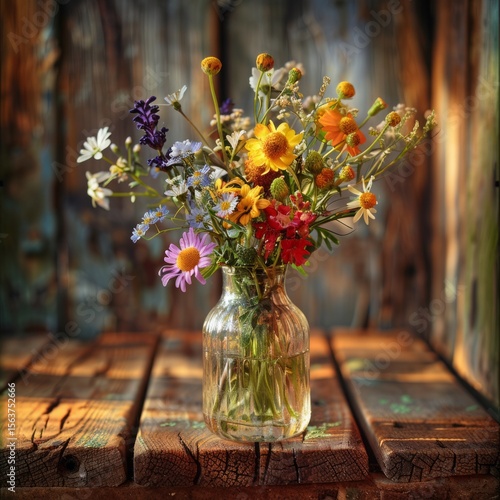 Vintage glass vase with wildflowers on a rustic wooden table - warm and nostalgic