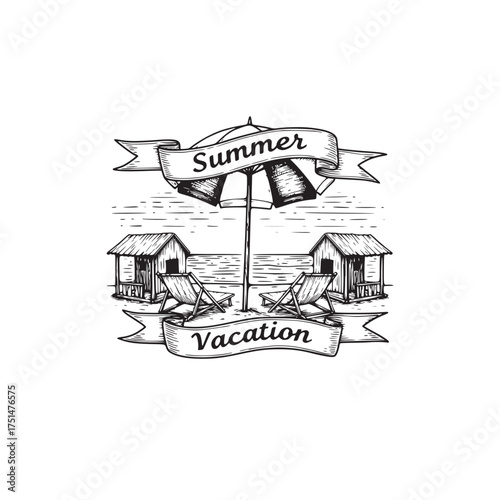 Vintage Hand-Drawn Black and White Summer Beach Vacation Scene Illustration