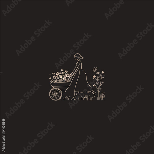 Vintage hand-drawn sketch of a woman walking while pulling a rustic wheelbarrow filled with blooming flowers.