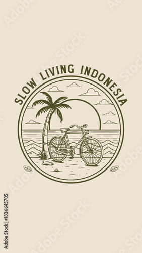Vintage illustration of a bicycle parked on a beach with a palm tree and the sun setting over the ocean, promoting slow living in Indonesia.
