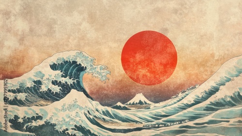 Vintage Japanese Wave with Red Sun: Nature's Harmony in Classic Art Style