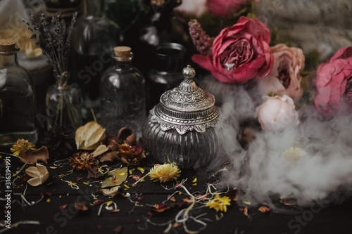 vintage jars, bottles, containers, flowers in smoke and dry leaves on a wooden table with warm light
