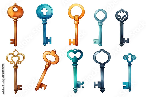 Vintage Keys Illustration Collection of Various Styles and Colors on Black